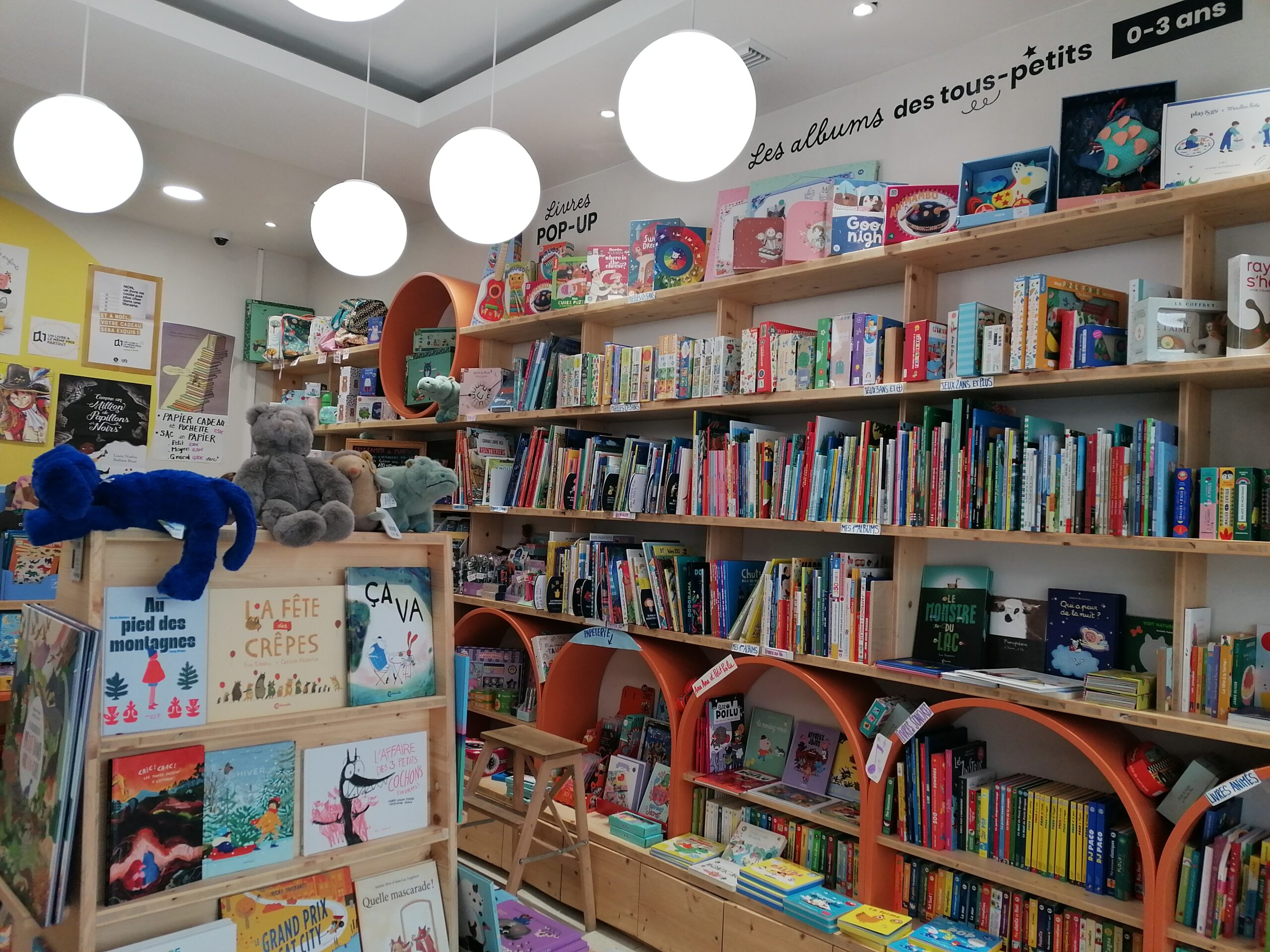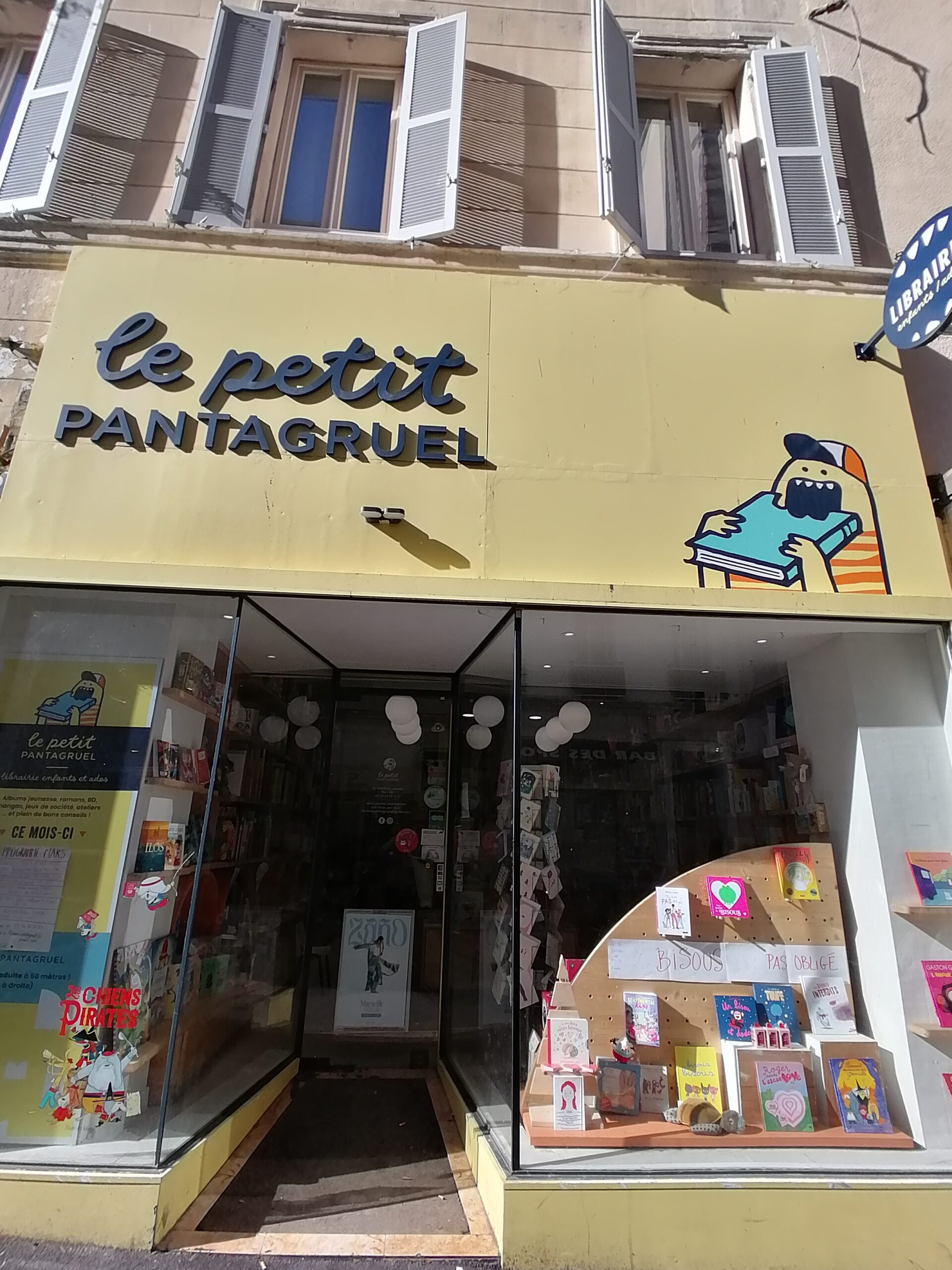 Située à 50m de sa grande sœur généraliste, la librairie Petit Pantagruel a l'allure d'une maison de ville de 65m2, dont l'odeur de bois frais flotte encore dans l'air. Lumineuse, elle se décompose en 3 pièces distinctes : une petite jaune sous les toits, parfaite pour les animations, une deuxième en contrebas de l'escalier, au calme, remplie de BD-mangas, et la plus grande, cœur de la librairie, qui accueille les parents, les poussettes et les enfants galopants…