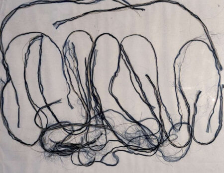 A partir de bouts de tissus toutes catégories, tout état, toutes couleurs, Eliane Robin déstructure “fil à fil” chaque pièce pour recomposer une forme choisie ou improvisée au fur et à mesure de la manipulation. Les fils deviennent une forme d’écriture. Puis elle quitte l’élément “fil” pour d’autres objets reconnus par hasard, quel que soit leur état: en fer, en bois, en béton et autres… Avec les mêmes fils on peut passer de la fragilité à la résistance en les mettant au service de la tapisserie mais en utilisant les mêmes matériaux de récupération. Une autre écriture est en élaboration. L’objectif est de les redessiner, les compléter avec d’autres matériaux et inspirer une autre vie.
